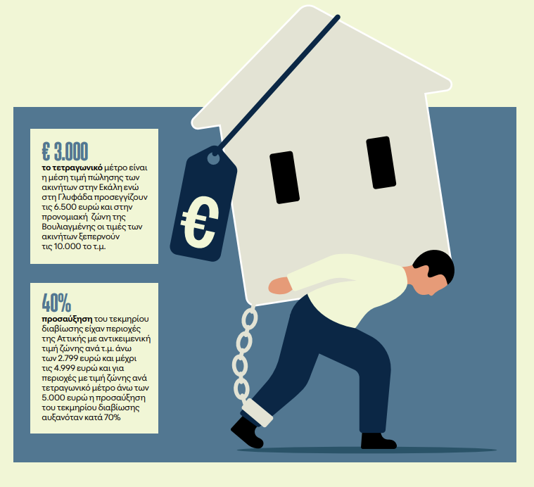 Ακριβές περιοχές της Αττικής με αντικειμενική τιμή ζώνης ανά τετραγωνικό μέτρο άνω των 2.799 ευρώ και μέχρι τις 4.999 ευρώ βαρύνονταν με προσαύξηση του τεκμηρίου διαβίωσης κατά 40% και για περιοχές με τιμή ζώνης ανά τετραγωνικό μέτρο άνω των 5.000 ευρώ η προσαύξηση του τεκμηρίου διαβίωσης αυξανόταν κατά 70%.
