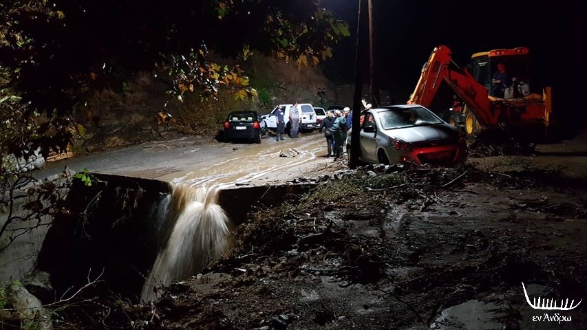 Ένα άλλο αυτοκίνητο το πέταξαν τα νερά πάνω σε μια κολόνα της ΔΕΗ. Αυτός θα μπορούσε να πει κανείς πως ήταν σχετικά τυχερός. Γιατί αν δεν ήταν η κολόνα μπορεί να πήγαινε στον γκρεμό. Και τι έβρισκε μετά ο άνθρωπος. Εδώ πυροσβέστες, δασοπυροσβέστες και περίοικοι κοιτάνε να δουν τι μπορούν να κάνουν.