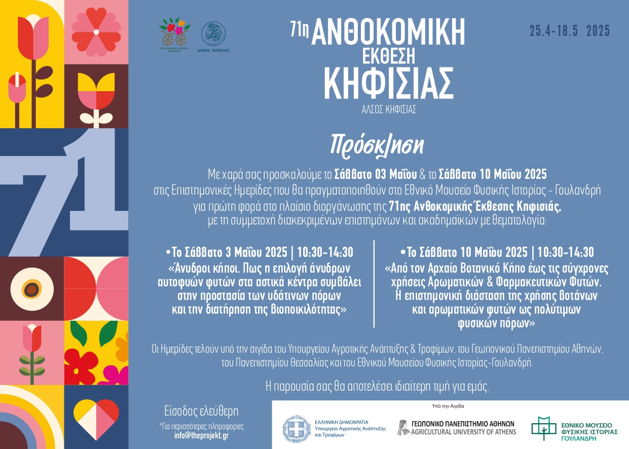 Στις επιστημονικές ημερίδες που θα πραγματοποιηθούν στο Εθνικό Μουσείο Φυσικής Ιστορίας – Γουλανδρή για πρώτη φορά στο πλαίσιο διοργάνωσης της 71ης Ανθοκομικής Έκθεσης Κηφισιάς, με τη συμμετοχή διακεκριμένων επιστημόνων και ακαδημαϊκών με θεματολογία: