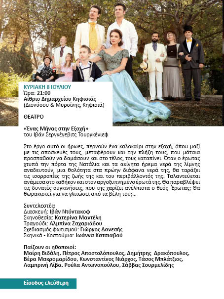 Ένας μήνας στην Εξοχή. Θεατρική παράσταση απόψε 8/07 στο Δημαρχείο Κηφισιάς με τη Μαίρη Βιδάλη.