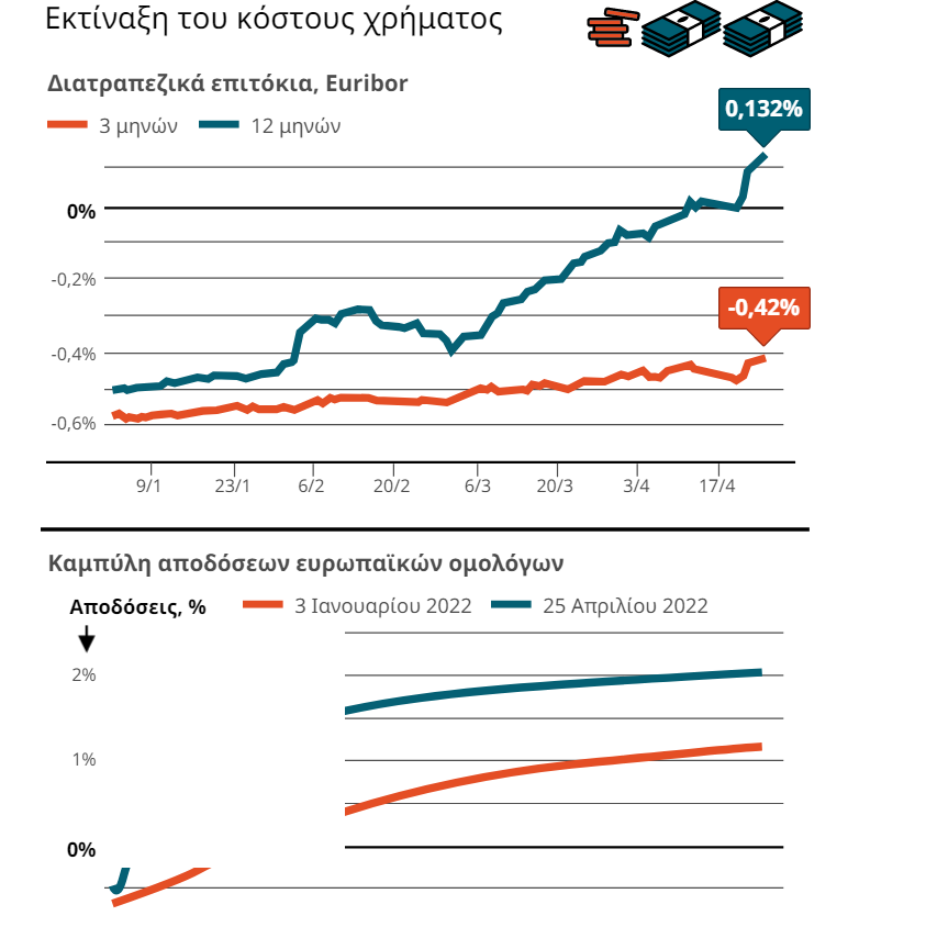 Πρόκειται για μια επιταχυνόμενη αύξηση του κόστους χρήματος, η οποία αντανακλά τις πληθωριστικές προσδοκίες και τις προβλέψεις για αύξηση των επιτοκίων από την Ευρωπαϊκή Κεντρική Τράπεζα (ΕΚΤ) στα τέλη του 2022 ή αρχές του 2023 κατά περίπου μισή μονάδα, σύμφωνα με τραπεζικά στελέχη. Η ανοδική πορεία του κόστους χρηματοδότησης των τραπεζών επιταχύνθηκε μέσα στον Απρίλιο, λόγω ενίσχυσης της αβεβαιότητας από τον πόλεμο στην Ουκρανία, τη διάρκεια της κρίσης και την ενεργειακή κρίση.