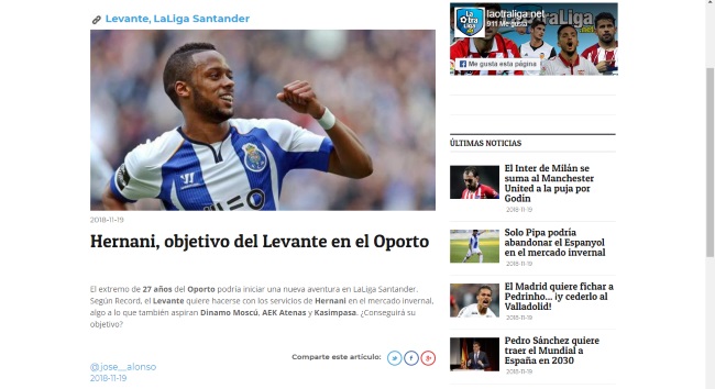O 27χρονος εξτρέμ εξακολουθεί να βρίσκεται στην λίστα της πρωταθλήτριας Ελλάδας και όπως αναφέρει το δημοσίευμα ο Ερνάνι αναμένεται τον Ιανουάριο να αποχωρήσει από την Πόρτο.