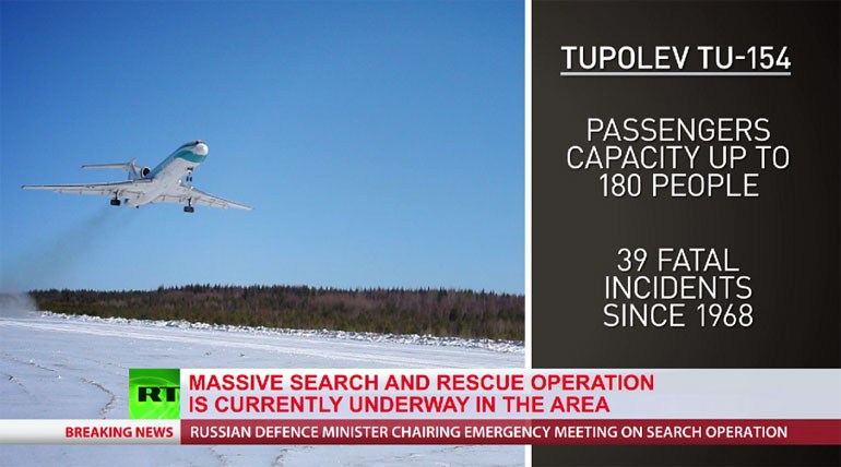 Συναγερμός έχει σημάνει στη Ρωσία καθώς αεροσκάφος της Πολεμικής Αεροπορίας τύπου Tupolev-154, που εξαφανίστηκε μυστηριωδώς από τα ραντάρ είκοσι λεπτά μετά την απογείωσή του από το αεροδρόμιο του Σότσι στη Μαύρη Θάλασσα, συνετρίβη. Στο αεροσκάφος επέβαιναν 92 άτομα (84 επιβάτες και 8 μέλη πλήρωμα).