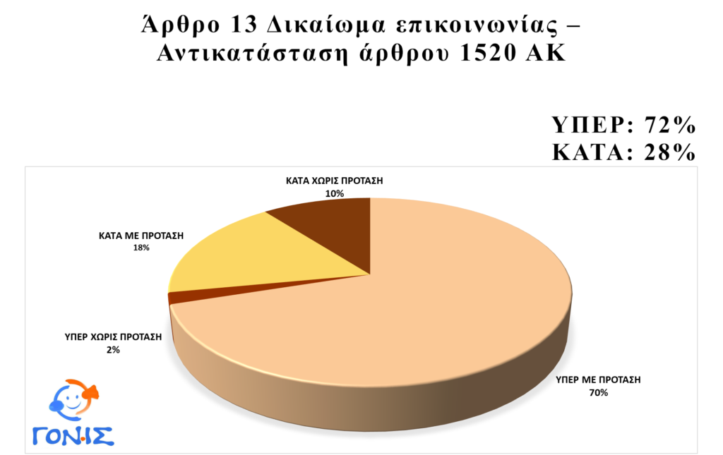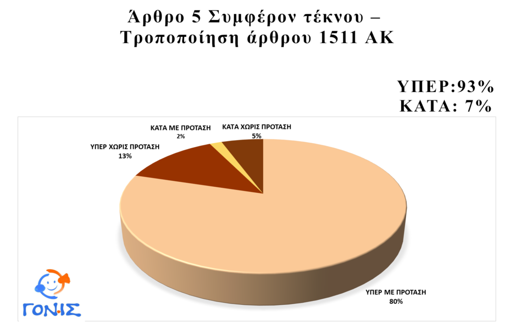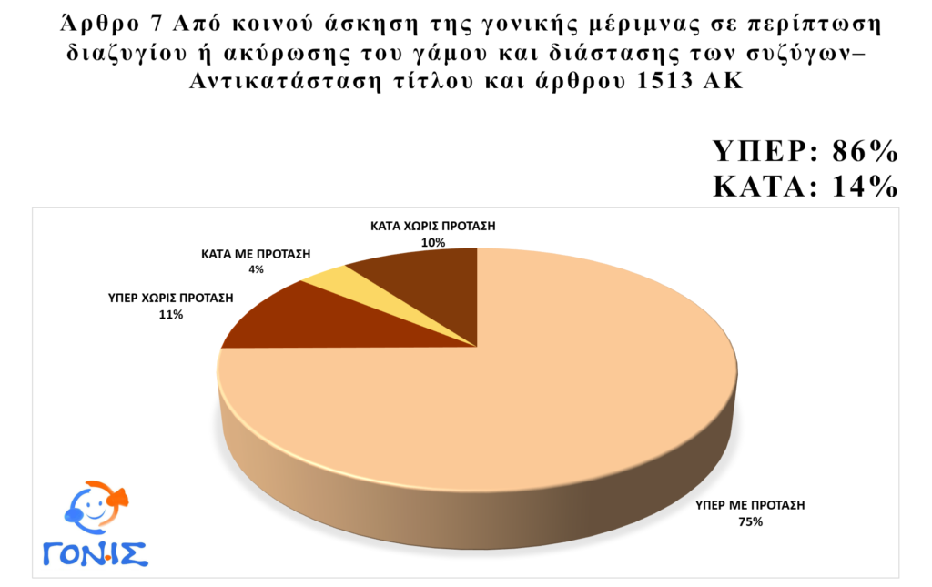 Η κοινωνία συμφωνεί στη συντριπτική πλειοψηφία της με την ανάγκη για κοινή ανατροφή. Ελάχιστη απόδειξη της καθολικής σχεδόν αποδοχής της κοινής επιμέλειας είναι ότι στη διαβούλευση επί της νομοθετικής πρωτοβουλίας του Υπουργείου Δικαιοσύνης που έληξε με πρωτοφανή συμμετοχή (14.815 σχόλια), το 80% των σχολίων περίπου τάσσονται υπέρ της κοινής επιμέλειας και προέρχονται ισοπόσως και από άνδρες και από γυναίκες. Ενδεικτικά στο άρθρο 5 του νομοσχεδίου για το 1511 ΑΚ τα σχόλια υπέρ της ανάγκης μεταρρύθμισης τάχθηκε το 81,4% επί συνόλου 2007 σχολίων και κατά το 18,6%. Επίσης, στο άρθρο 14 του νομοσχεδίου για την αντικατάσταση του άρθρου 1532 ΑΚ που αφορά τις συνέπειες κακής άσκησης αναρτήθηκαν 1256 σχόλια εκ των οποίων υπέρ του σχεδίου ήταν 1001 σχόλια, ποσοστό 82%, και εναντίον 212 σχόλια, ποσοστό 18%. Στο άρθρο 13 του νομοσχεδίου για την αντικατάσταση του 1520 ΑΚ, που αφορά την επικοινωνία (μαχητό τεκμήριο 1/3) αναρτήθηκαν 1766 σχόλια εκ των οποίων υπέρ του σχεδίου ήταν σε ποσοστό το 72% και εναντίον το 28%. Τα παραπάνω στοιχεία αποδεικνύουν όχι μόνο ότι η κοινωνία απαιτεί την μεταρρύθμιση αλλά ότι θέλει αυτή η μεταρρύθμιση να είναι ακόμα και πιο ριζοσπαστική από το νόμο προς ψήφιση και ότι γνωρίζει τι ακριβώς συμβαίνει και από αυτό τεκμαίρεται ότι γνωρίζει και τι θέλει ακριβώς να αλλάξει.