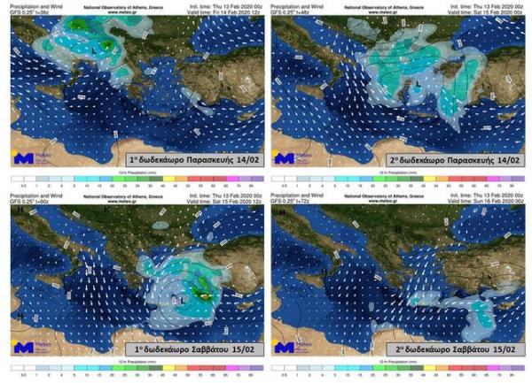 Στους χάρτες που ακολουθούν φαίνεται η κίνηση του χαμηλού, ο υετός και η ταχύτητα και διεύθυνση του ανέμου κατά το διήμερο Παρασκευή 14/02 – Σάββατο 15/02.