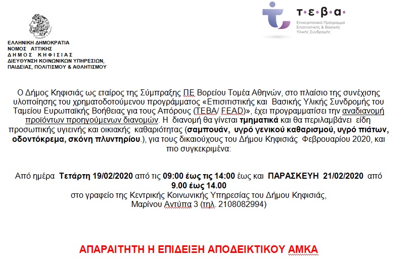 Ο Δήμος Κηφισιάς ως εταίρος της Σύμπραξης ΠΕ Βορείου Τομέα Αθηνών, στο πλαίσιο της συνέχισης υλοποίησης του χρηματοδοτούμενου προγράμματος «Επισιτιστικής και Βασικής Υλικής Συνδρομής του Ταμείου Ευρωπαϊκής Βοήθειας για τους Απόρους (ΤΕΒΑ/ FEAD)», έχει προγραμματίσει την αναδιανομή προϊόντων προηγούμενων διανομών.