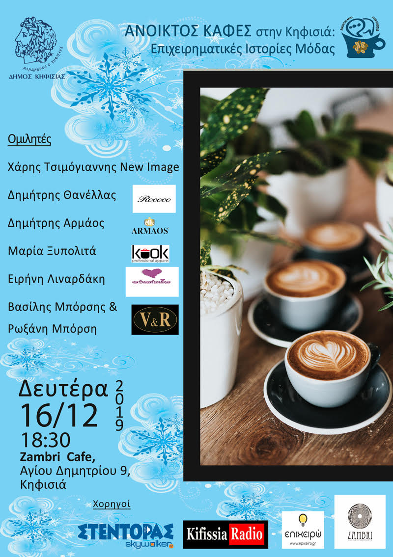 ΤΟΠΙΚΑ Ανοικτός καφές απόψε 16/12 στο ZAMBRI στην Κηφισιά. Επιχειρηματικές Ιστορίες Μόδας. Από john - 16 Δεκεμβρίου 2019 0 636 FacebookTwitterPinterestWhatsApp ΔΗΜΟΣ ΚΗΦΙΣΙΑΣ/Πρόσκληση στον ΑΝΟΙΚΤΟ ΚΑΦΕ – “Επιχειρηματικές ιστορίες Μόδας” 16/12 (ώρα 18:30)