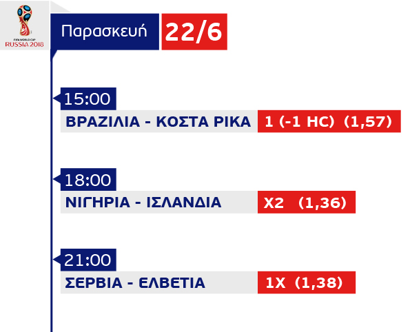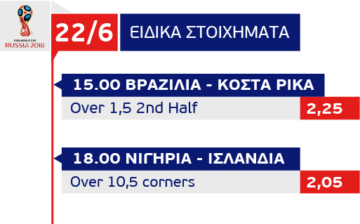 ΠΑΓΚΟΣΜΙΟ ΚΥΠΕΛΛΟ (15.00) Brazil – Costa Rica : Over 2,5 (1,60)