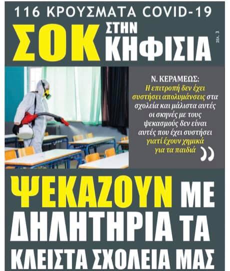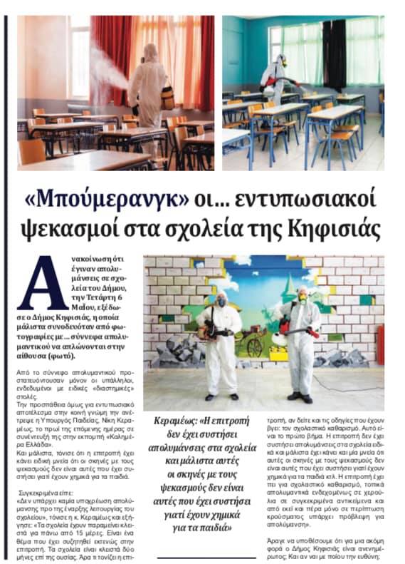 Την Παρασκευή 8 Μαΐου η εφημερίδα «Τύπος Κηφισιάς» στο πρωτοσέλιδο της, αναφερόμενη στις απολυμάνσεις που διενήργησε ο Δήμος στα Γυμνάσια και Λύκεια, έγραψε, το άκρως ανησυχητικό: «ψεκάζουν με δηλητήρια τα κλειστά σχολεία μας»!