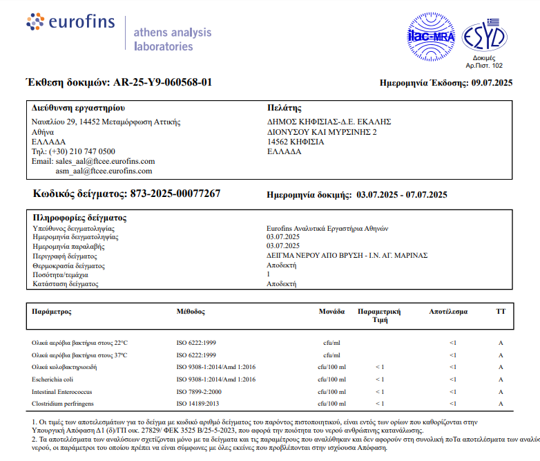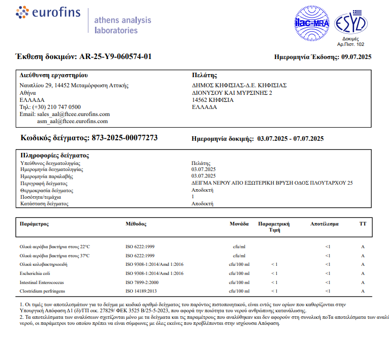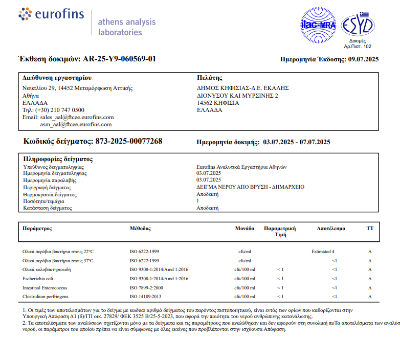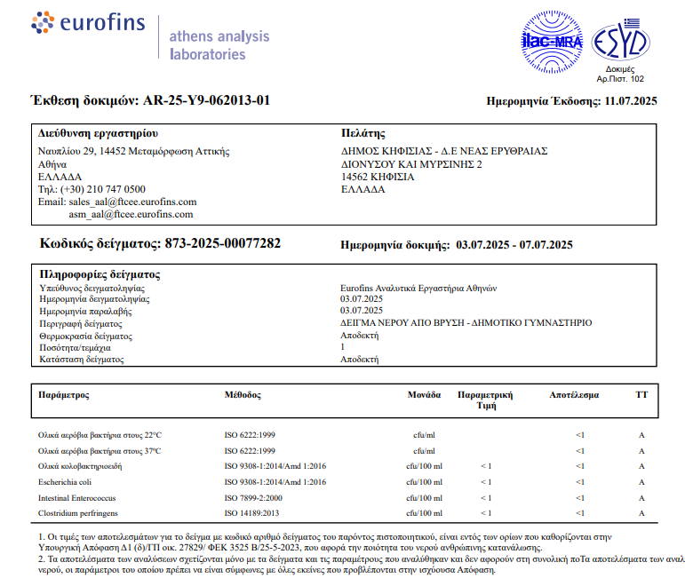 Σύμφωνα με το άρθρο Δ παράγραφος 2.1 της υπ’ αριθμ. εγκυκλίου 27829/15-5-2023 της Γενικής Διεύθυνσης Δημόσιας Υγείας και Ποιότητας Ζωής του Υπουργείου Υγείας, ο Δήμος Κηφισιάς αναρτά/δημοσιοποιεί τα αναλυτικά αποτελέσματα των εκθέσεων δοκιμών που πραγματοποιήθηκαν κατά τον μήνα Ιούνιο του τρέχοντος έτους σε έντεκα (11) διαφορετικά σημεία του δικτύου υδροδότησης και των τριών Δημοτικών Ενοτήτων – Κηφισιάς – Νέας Ερυθραίας και Εκάλης. Σύμφωνα με τα αποτελέσματα των τελευταίων μετρήσεων η ποιότητα του δείγματος και στα 11 σημεία ήταν κανονική.
