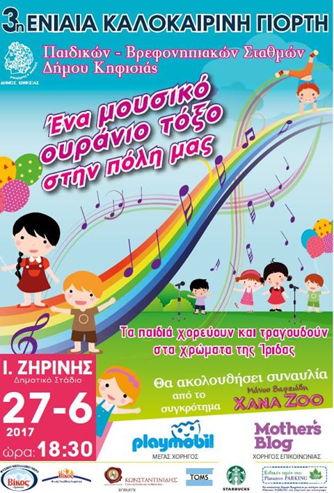 Η “3η Ενιαία Γιορτή των Παιδικών και Βρεφονηπιακών Σταθμών” του Δήμου Κηφισιάς θα πραγματοποιηθεί τελικά την Τρίτη 27 Ιουνίου 2017, στις 18:30, στο Αθλητικό Κέντρο «Ι. Ζηρίνης», καθώς την Παρασκευή που μας πέρασε ο καιρός δεν μας επέτρεψε να προχωρήσουμε στην εκδήλωση.