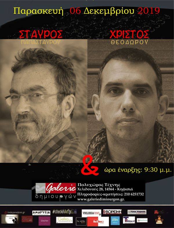 Ο Σταύρος Παπασταύρου (κιθάρα-φωνή) και ο Χρίστος Θεοδώρου (πιάνο) συναντιούνται στην «ΓΚΑΛΕΡΙ ΔΗΜΙΟΥΡΓΩΝ» για μια βραδιά με δικά τους τραγούδια, δισκογραφημένα και ανέκδοτα, καθώς και μία επιλογή από αγαπημένα τραγούδια άλλων συνθετών, που απετέλεσαν γι’ αυτούς πηγή έμπνευσης.