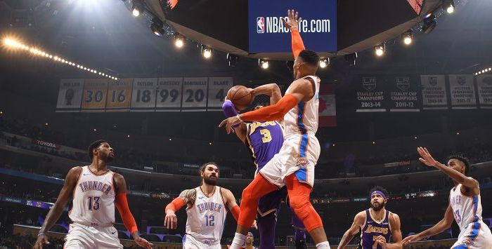 Οι Οκλαχόμα Σίτι Θάντερ νίκησαν 107-100 τους Λος Άντζελες Λέικερς και πανηγύρισαν την 23η εφετινής τους νίκη στην κανονική περίοδο του ΝΒΑ. Κορυφαίος για τους νικητές ήταν ο Πολ Τζορτζ, ο οποίος σημείωσε 37 πόντους σε 34,21 λεπτά συμμετοχής. Επίσης, ο Αμερικανός παίκτης είχε τέσσερα ριμπάουντ, τέσσερα κλεψίματα και δυο ασίστ. Εξαιρετική εμφάνιση από τον Ράσελ Ουέστμπρουκ, ο οποίος σημείωσε triple doulbe με 14 πόντους, 16 ριμπάουντ και δέκα ασίστ. Στους 14 πόντους και ο Στίβεν Άνταμς, ο οποίος είχε και 15 ριμπάουντ, σημειώνοντας double double.