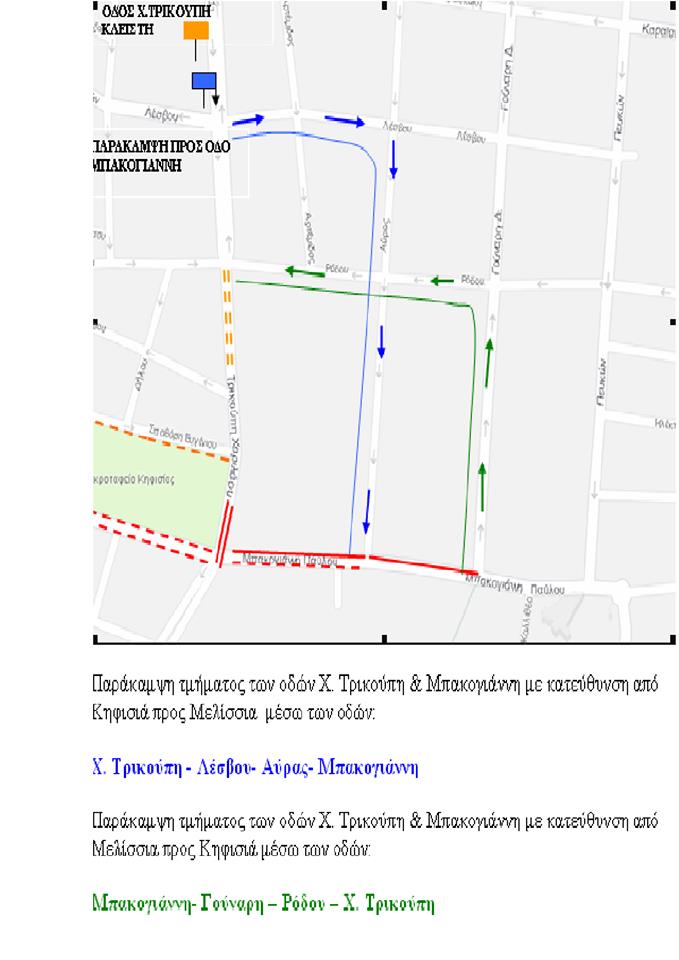 όσοι κινούνται από Μπακογιάννη προς Χαρ. Τρικούπη θα οδηγηθούν από Μπακογιάννη > Γούναρη> Ρόδου> Χαρ. Τρικούπη.