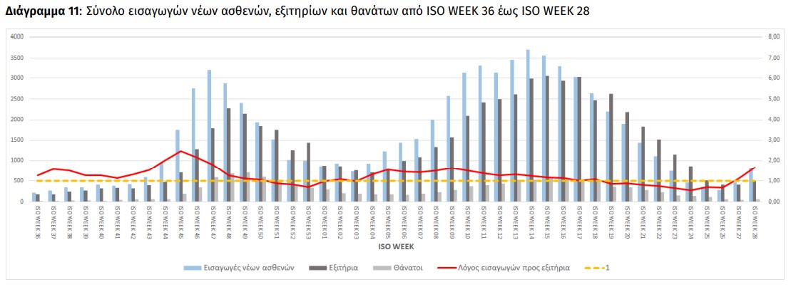 Την ίδια στιγμή δόθηκαν στη δημοσιότητα τα στοιχεία για την εισαγωγή νέων ασθενών, εξιτηρίων και θανάτων από τις 12 έως τις 18 Ιουλίου. Οι εισαγωγές νέων ασθενών ήταν 820, ενώ το σύνολο των εξιτηρίων λόγω ίασης ήταν 494. O λόγος εισαγωγών νέων ασθενών προς εξιτήρια λόγω ίασης ήταν 1.66.