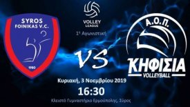 Με το ντέρμπι μεταξύ του Α.Ο.Φοίνικα Σύρου και του Α.Ο.Π.Κηφισιάς συνεχίζεται την Κυριακή 3 Νοεμβρίου η 1η αγωνιστική του πρωταθλήματος Volley League. Ο αγώνας θα αρχίσει στις 16.30 στο γυμναστήριο Δ.Βικέλας.