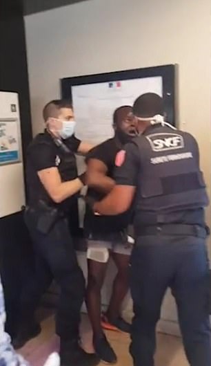 Η εταιρεία σιδηροδρόμων SNCF ανέφερε ότι η γυναίκα δάγκωσε και έφτυσε τους άνδρες ασφαλείας και γι΄ αυτό το προσωπικό ενήργησε με αυτό τον τρόπο.