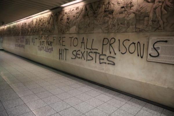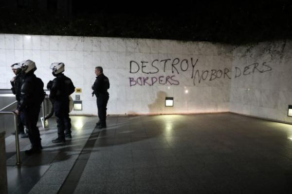 Οι κουκουλοφόροι έγραψαν συνθήματα κατά της αστυνομίας και της προσφυγικής δομής της Μόριας πάνω στα αγάλματα που υπάρχουν στην αποβάθρα.