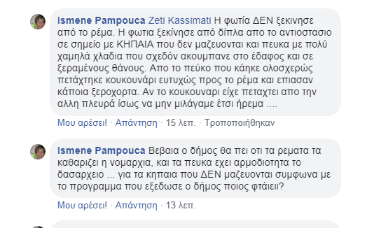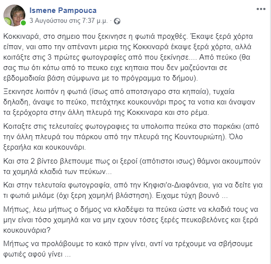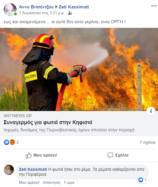 Δημότης κάνει ανάρτηση στα social media δηλώνοντας οργισμένη για φωτιά στην Πολιτεία τις προηγούμενες ημέρες. Σήμερα 5 Αυγούστου η αντιδήμαρχος κα Ζ. Κασσιμάτη αποφασίζει να απαντήσει στο post της κας Α. Βιτσέντζου και δηλώνει ότι η φωτιά δεν ήταν σε σημείο ευθύνης του Δήμου αλλά μέσα στο ρέμα το οποίο είναι ευθύνη της περιφέρειας.