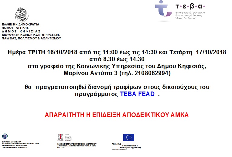 Στο πλαίσιο του Επιχειρησιακού Προγράμματος «Επισιτιστικής και Βασικής Υλικής Συνδρομής για το Ταμείο Ευρωπαϊκής Βοήθειας για τους Απόρους (TEBA/FEAD)», θα πραγματοποιηθεί από τον Δήμο Κηφισιάς διανομή ειδών τροφίμων στους δικαιούχους του προγράμματος ΚΕΑ – ΤΕΒΑ, την Τρίτη 16/10/2018 από τις 11:00 έως τις 14:30 και Τετάρτη  17/10/2018 από 8.30 έως 14.30 στο γραφείο Κοινωνικής Υπηρεσίας του Δήμου Κηφισιάς (Μαρίνου Αντύπα).