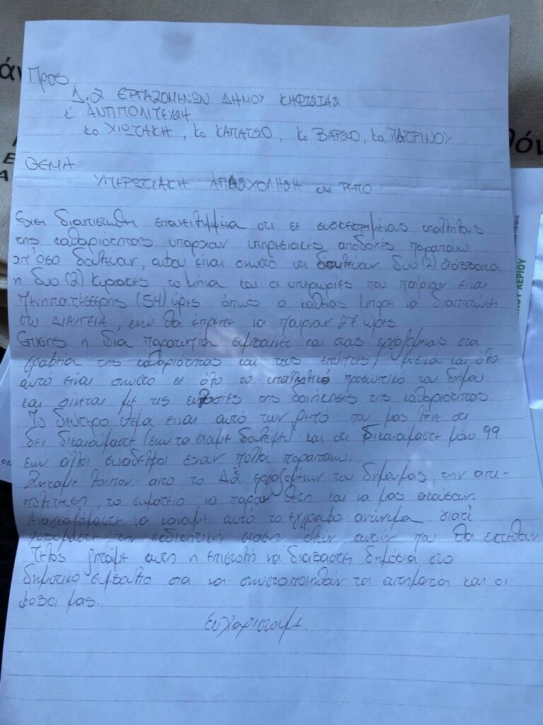 Σύμφωνα με την επιστολή μερίδα εργαζομένων έλαβε αμοιβές για 54 ώρες απασχόλησης ενώ στην πργματικότητα οι ώρες ήταν 27 !