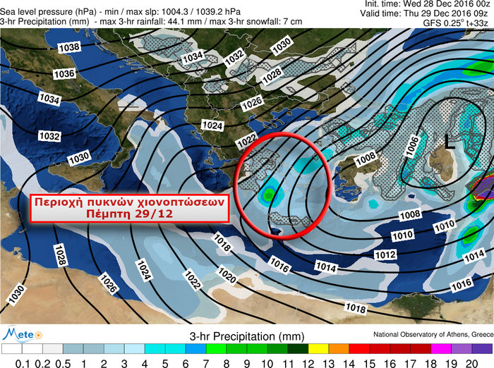 Πιο αναλυτικά για την Πέμπτη προβλέπονται χιονοπτώσεις στην Ανατολική Θεσσαλία (Μαγνησία – Πήλιο) και κυρίως στην Εύβοια, στις Σποράδες, στην Ανατολική Στερεά (συμπεριλαμβανομένης της Αττικής), στη Βορειοανατολική Πελοπόννησο, με κατά τόπους έντονα φαινόμενα τις πρωινές ώρες.