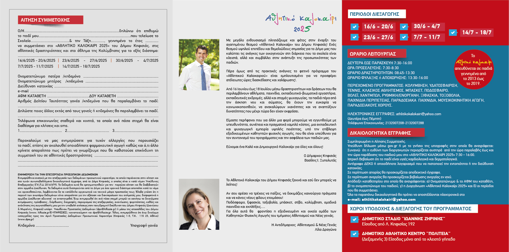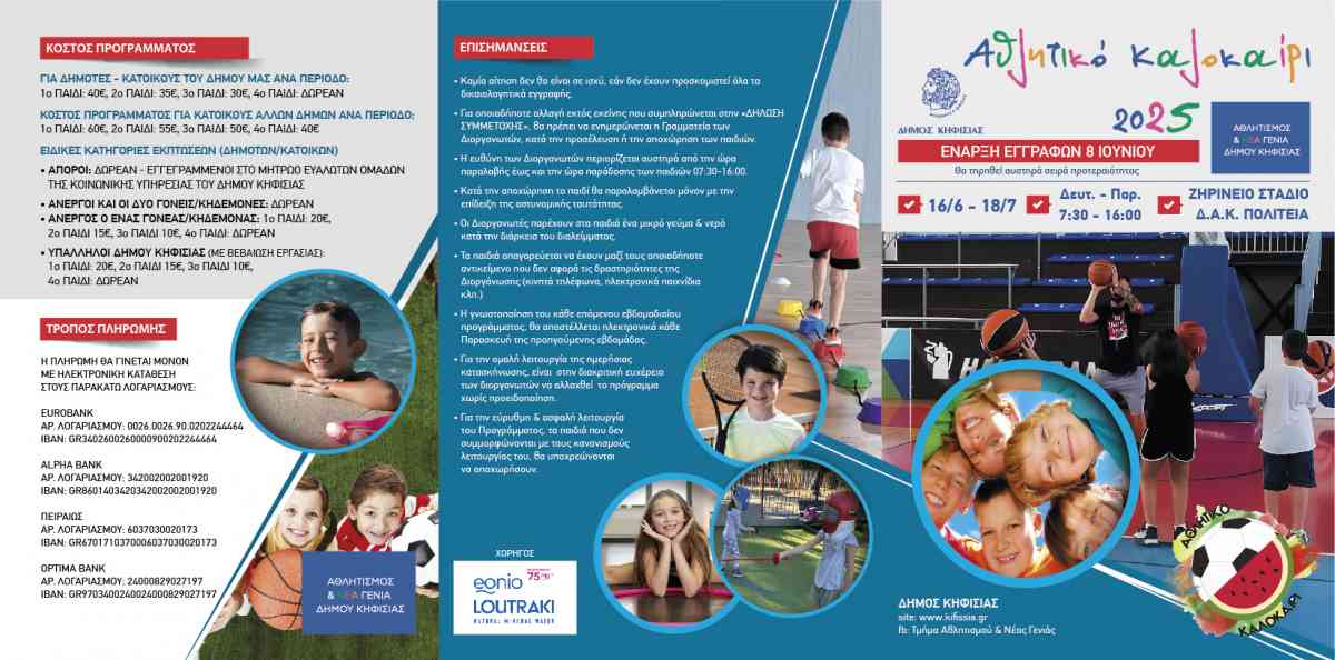Το Τμήμα Αθλητισμού & Νέας Γενιάς του Δήμου Κηφισιάς θα πραγματοποιήσει και φέτος την επιτυχημένη ημερήσια αθλητική κατασκήνωση για παιδιά γεννημένα από το 2013 έως το 2019 «ΑΘΛΗΤΙΚΟ ΚΑΛΟΚΑΙΡΙ 2025».