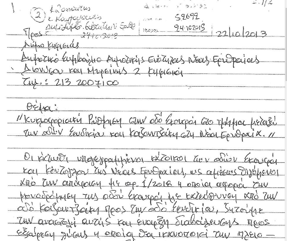 Τις προηγούμενες ημέρες υπήρξε κατάθεση επιστολής διαμαρτυρίας δημοτών κυρίως της οδού Κόντογλου στην Νέα Ερυθραία, για την απόφαση μονοδρόμησης της οδού Σκουφά (Από Καζαντζάκη – μέχρι Σευδικίου) , η οποία αν εφαρμοσθεί ως έχει τους αναγκάζει να κάνουν επιπλέον κύκλο ενός χιλιομέτρου προκειμένου να πάνε στις οικίες τους.