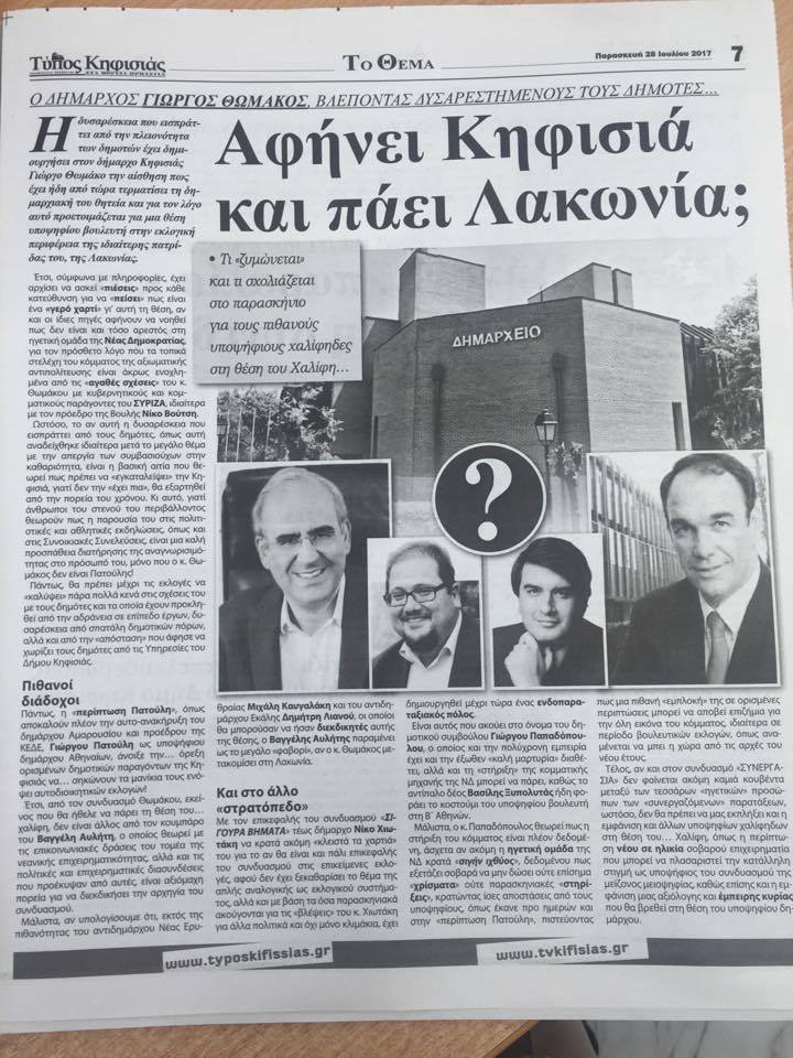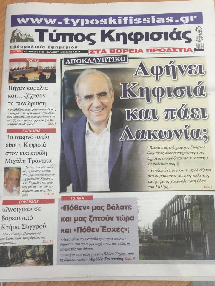 Ο Δήμαρχος αναφέρεται στο πρωτοσέλιδο της εφημερίδας <<Τύπος της Κηφισιάς που κυκλοφόρησε σήμερα 28 Ιουλίου με το ακόλουθο πρωτοσέλιδο.