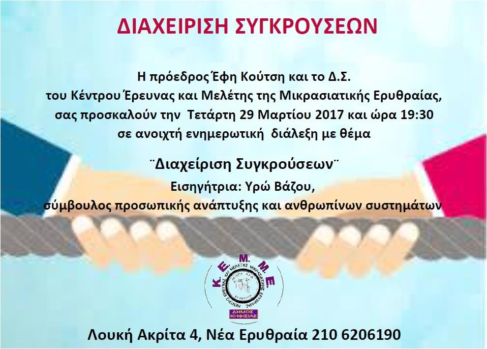 ΤΟΠΙΚΑ Διαχείριση Συγκρούσεων με την Υρώ Βάζου. Σήμερα 29/03 στο ΚΕΜΜΕ Από john - 29 Μαρτίου 2017 0 271 FacebookTwitterPinterestWhatsApp