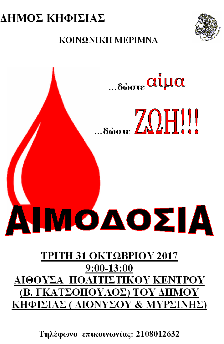 Εθελοντική αιμοδοσία θα πραγματοποιηθεί από την Κοινωνική Μέριμνα του Δήμου Κηφισιάς την Τρίτη 31 Οκτωβρίου 2017 από 9:00 έως 13:00 στην Αίθουσα Πολιτιστικού Κέντρου του Δήμου Κηφισιάς (Διονύσου και Μυρσίνης, τηλ. 2108012632).
