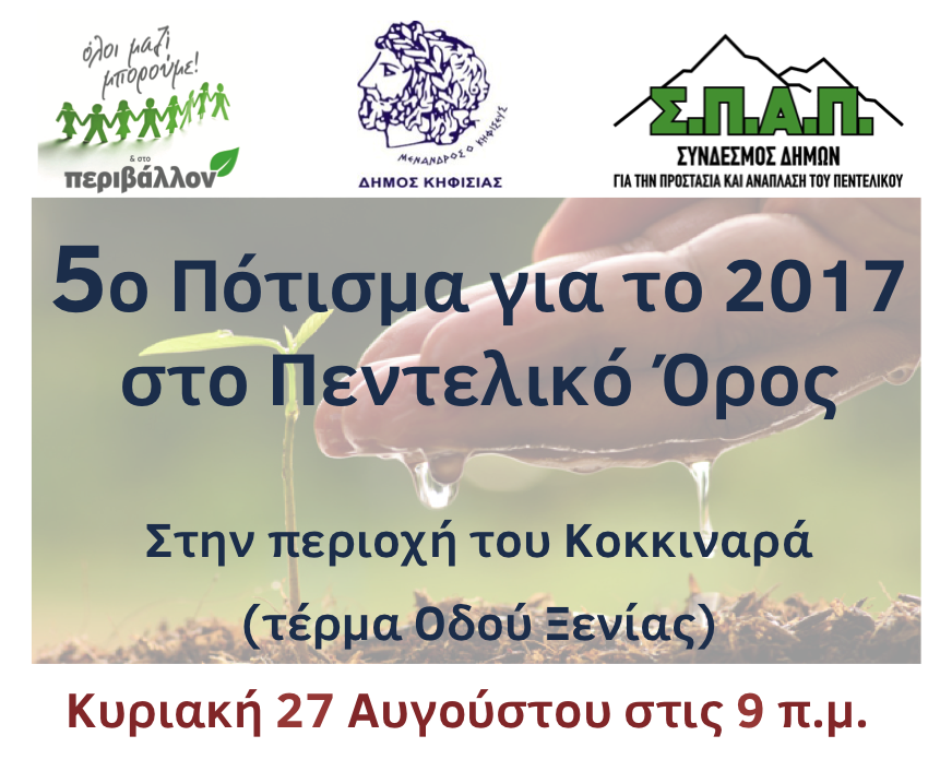 Ο Δήμος Κηφισιάς συνεχίζοντας την προσπάθεια για την όσο το δυνατόν καλύτερη αποκατάσταση του φυσικού περιβάλλοντος στο Πεντελικό όρος, διοργανώνει το 5ο Εθελοντικό Πότισμα 2017 στις αναδασωμένες περιοχές, στον Κοκκιναρά Κηφισιάς, σε συνεργασία με τον Σύνδεσμο Δήμων για την Προστασία και Ανάπλαση του Πεντελικού (Σ.Π.Α.Π.) και το Όλοι Μαζί Μπορούμε και στο Περιβάλλον, την Κυριακή 27 Αυγούστου 2017 στις 9 π.μ.