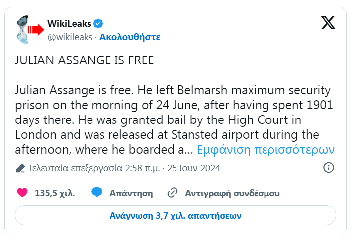 Σε ανάρτηση στην πλατφόρμα X (πρώην Twitter) το WikiLeaks χαιρετίζει την έκβαση που ήταν αποτέλεσμα «μιας παγκόσμιας εκστρατείας» η οποία έφθασε μέχρι τα Ηνωμένα Έθνη. «Καθώς επιστρέφει στην Αυστραλία, ευχαριστούμε όλους όσοι μας στήριξαν, αγωνίστηκαν για εμάς και παρέμειναν πλήρως αφοσιωμένοι στον αγώνα για την ελευθερία του», αναφέρει και συμπληρώνει: «Η ελευθερία του Τζούλιαν είναι η ελευθερία μας».