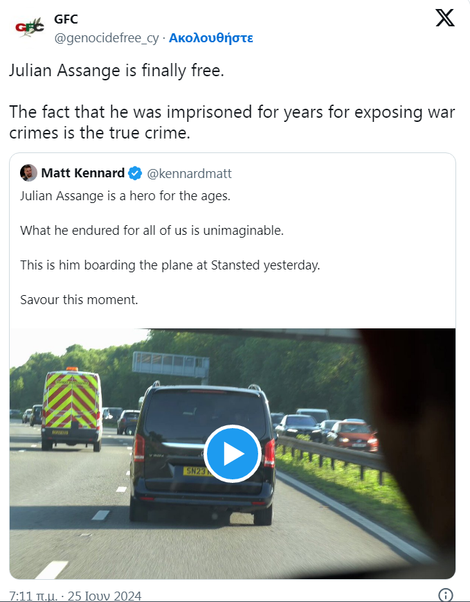 Το WikiLeaks δημοσιοποίησε ένα βίντεο που δείχνει τον Τζούλιαν Ασάνζ να περπατά ελεύθερος στην πίστα του αεροδρομίου, προτού επιβιβαστεί σε αεροσκάφος.