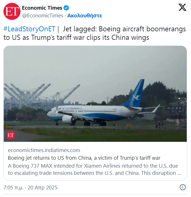Τον δρόμο της επιστροφής για τον κόμβο παραγωγής του στις ΗΠΑ πήρε την Κυριακή (20/4) το αεροσκάφος Boeing 737 MAX, το οποίο προοριζόταν για χρήση από κινεζική αεροπορική εταιρεία, την ώρα που ο πόλεμος των δασμών μεταξύ των δύο χωρών μαίνεται.