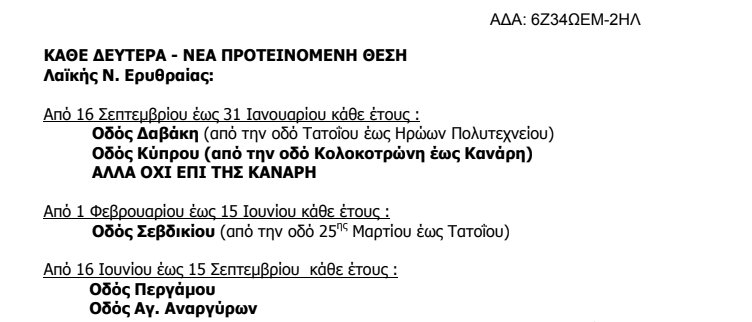 1. A. Η υπ’ αρ. 400/2019 απόφαση του Δημοτικού Συμβουλίου Κηφισιάς ορίζει (μεταξύ άλλων) ότι η λαϊκή αγορά Ν. Ερυθραίας θα λειτουργεί: «…Κάθε Δευτέρα, από 16 Σεπτεμβρίου έως 31 Ιανουαρίου κάθε έτους….Οδός Κύπρου (από την οδό Κολοκοτρώνη έως Κανάρη)».