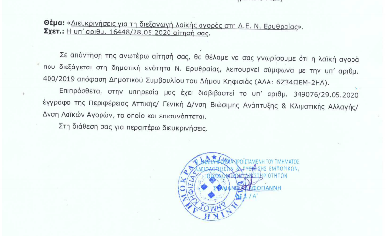 Κατόπιν αναρίθμητων διαμαρτυριών μας προς το αρμόδιο τμήμα του Δήμου Κηφισιάς αλλά και παρεμβάσεών μας στο Δημοτικό Συμβούλιο Κηφισιάς, όπου ουδέποτε εισακούσθησαν τα νόμιμα αιτήματά μας και μάλιστα γίναμε δέκτες δηκτικών σχολίων, λάβαμε την με αρ. πρωτ. 16448/3-6-2020 απάντηση σε σχετική αίτησή μας, όπου ρητώς αναφέρεται ότι «…η λαϊκή αγορά που διεξάγεται στη δημοτική ενότητα Ν. Ερυθραίας λειτουργεί σύμφωνα με την υπ’ αρ. 400/2019 απόφαση Δημοτικού Συμβουλίου του Δήμου Κηφισιάς», η οποία, επαναλαμβάνουμε, ορίζει ότι η λαϊκή αγορά θα λειτουργεί «…Κάθε Δευτέρα, από 16 Σεπτεμβρίου έως 31 Ιανουαρίου κάθε έτους….Οδός Κύπρου (από την οδό Κολοκοτρώνη έως Κανάρη)».