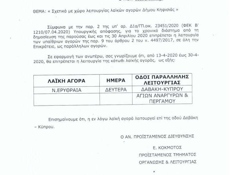 Β. Με την με αρ. πρωτ. 20-4-2020 επιστολή της Διεύθυνσης Λαϊκών Αγορών της Περιφέρειας Αττικής σχετικά με τη λειτουργία λαϊκών αγορών του Δήμου Κηφισιάς (κοινοποιούμενη προς τους Αντιδημάρχους Κηφισιάς κ. Αυλήτη και Καυγαλάκη), επετράπη, από χρονικό διάστημα από 13-4-2020 έως 30-4-2020 και κάθε Δευτέρα, η λειτουργία επί των οδών Δαβάκη-Κύπρου και Αγ. Αναργύρων και Περγάμου, ως παράλληλων αγορών.