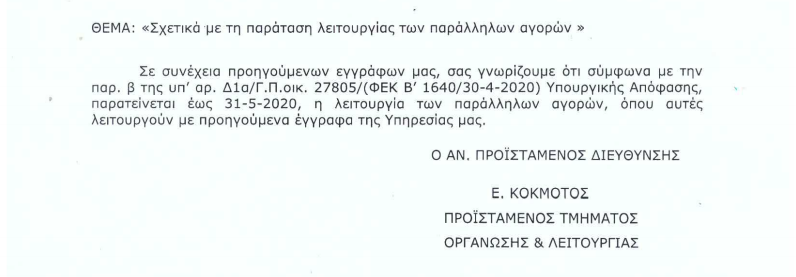 Γ. Με την με αρ. πρωτ. 13689/7-5-2020 επιστολή της Διεύθυνσης Λαϊκών Αγορών της Περιφέρειας Αττικής σχετικά με τη λειτουργία των παράλληλων αγορών (κοινοποιούμενη προς τους Αντιδημάρχους Κηφισιάς κ. Αυλήτη και Καυγαλάκη), γνωστοποιήθηκε η απόφαση της παράτασης λειτουργίας των παράλληλων των υπό στοιχείο (Β) ως άνω αγορών έως τις 31-5-2020. Τονίζουμε βέβαια ότι ΟΥΔΕΠΟΤΕ έχει λειτουργήσει η λαϊκή αγορά, ως παράλληλης, επί των οδών Αγ. Αναργύρων και Περγάμου, ως εκ των αποφάσεων αυτών ορίζεται, και ως μέτρο πρόληψης της εξάπλωσης του ιού covid-19.