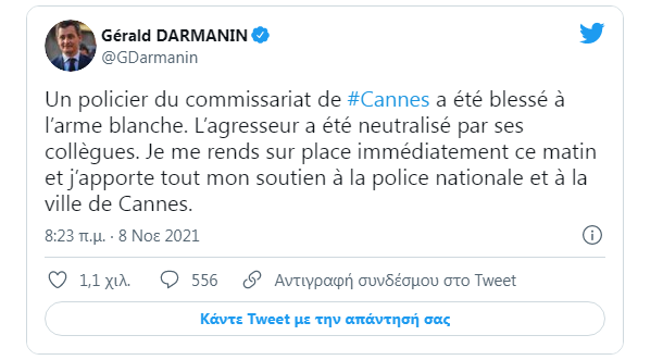 Μέσω Twitter, ο υπουργός Εσωτερικών Νταρμανέν ανέφερε πως μεταβαίνει στον τόπο της επίθεσης «αμέσως», εκφράζοντας «όλη του την υποστήριξή » στην αστυνομία και στην πόλη των Καννών, στη γαλλική Ριβιέρα.