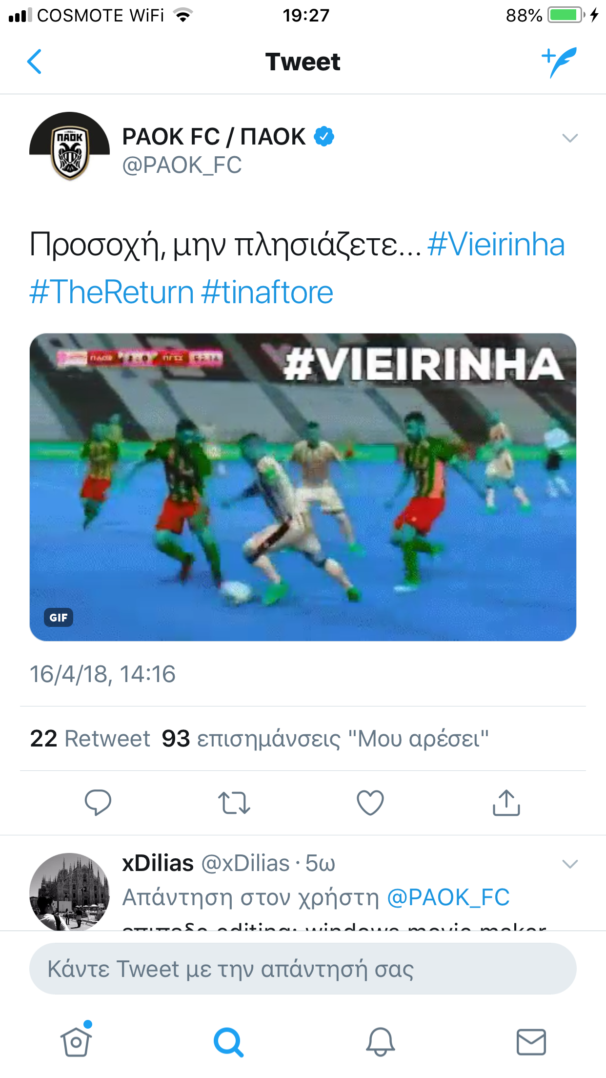 Τρία στιγμιότυπα, δείγματα υψηλής ποδοσφαιρικής ποιότητας που προσέφεραν οι Αντελίνο Βιεϊρίνια, Ομάρ Ελ Καντουρί και Ντιέγκο Μπίσεσβαρ, στο νικηφόρο αγώνα του περασμένου Σαββάτου με τον Πανιώνιο, δημοσίευσε η ΠΑΕ ΠΑΟΚ σ’ επίσημο λογαριασμό της σε μέσο κοινωνικής δικτύωσης, σχολιάζοντας για τον μεν πρώτο «προσοχή, μην … πλησιάζετε» και για τον δεύτερο «αριστοκρατική επιστροφή».