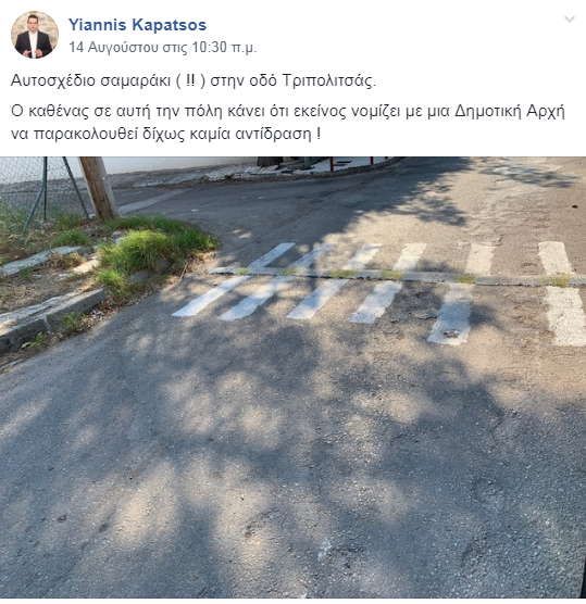 Ο Δημοτικός Σύμβουλος Γιάννης Καπάτσος είχε κάνει ανάρτηση στην ομάδα Κηφισιά Διαφάνεια στις 14 Αυγούστου για παράνομο, αυτοσχέδιο σαμαράκι πάνω στη διάβαση πεζών στην οδό Τριπολιτσάς.