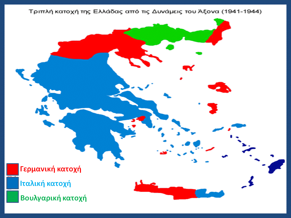 Με την κατάληψη της Κρήτης τον Μάιο του 1941 οι Γερμανοί ολοκλήρωσαν την κατάκτηση της Ελλάδας. Ήδη είχαν προχωρήσει στον σχηματισμό κατοχικής κυβέρνησης με πρωθυπουργό τον στρατιωτικό Τσολάκογλου, παραχωρώντας όμως στους Ιταλούς και τους Βούλγαρους τη διοίκηση του μεγαλύτερου μέρους της χώρας.