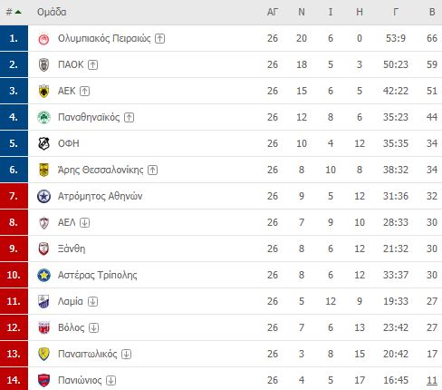 Με προβάδισμα 7 βαθμών μπαίνει στα play off ο Ολυμπιακός, καθώς Ξάνθη και ΠΑΟΚ ήρθαν ισόπαλοι 1-1! Δείτε τα αποτελέσματα της 26ης αγωνιστικής, την τελική βαθμολογία της κανονικής διάρκειας και ποιες ομάδες θα συμμετάσχουν σε play off και play out.