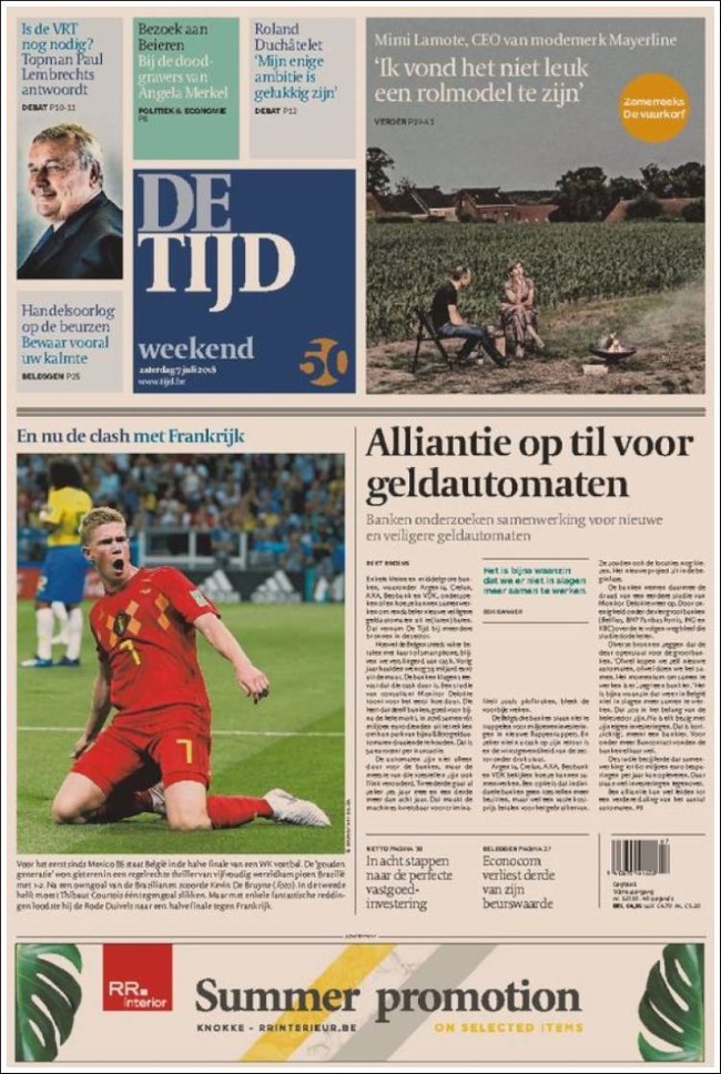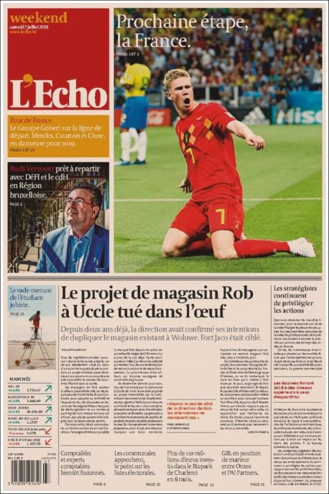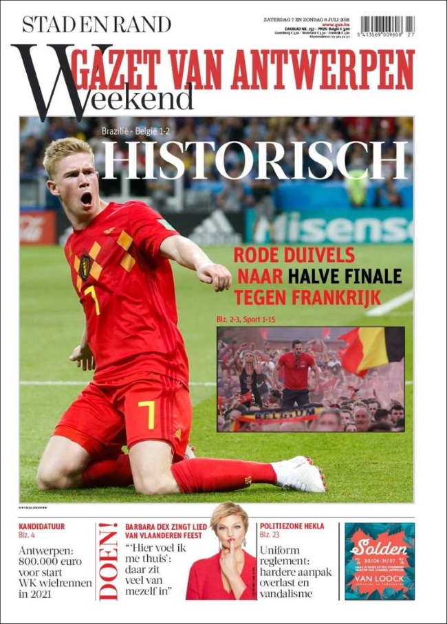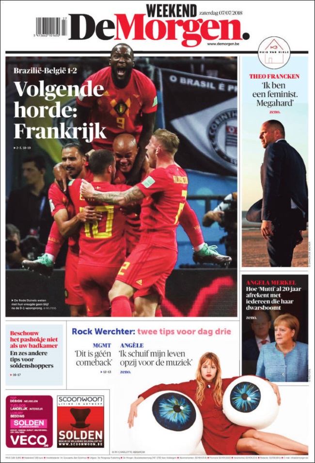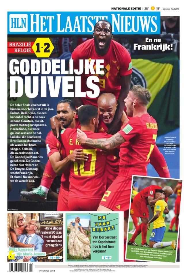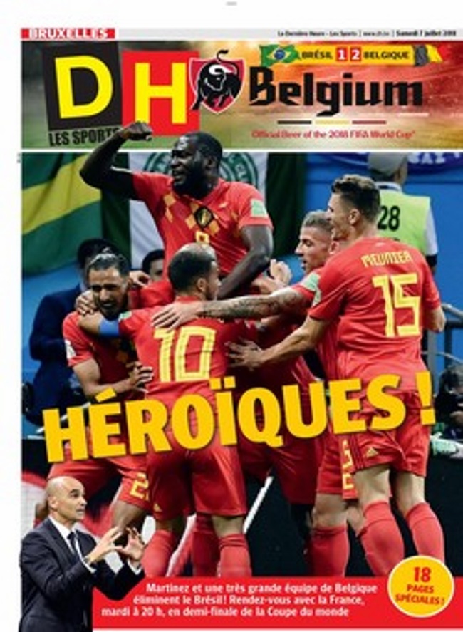 Πρώτο θέμα σε όλες τις εφημερίδες του Βελγίου η χθεσινή πρόκριση στα ημιτελικά του Μουντιάλ.