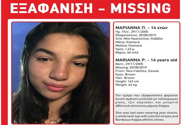 Τα ίχνη της 14χρονης Μαριάννας από τη Νέα Ηρακλείτσα Καβάλας, χάθηκαν στις 20 Αυγούστου και η τύχη της ακόμα και σήμερα, Παρασκευή, 30 Αυγούστου, αγνοείται.