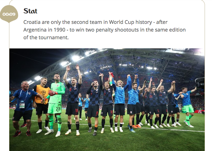 Η FIFA με τη λήξη του προημιτελικού της Ρωσίας με την Κροατία, υπογράμμισε ένα ενδιαφέρον στατιστικό. Η Κροατία είναι η δεύτερη χώρα μετά την Αργεντινή το 1990, η οποία καταφέρνει να βγει νικήτρια από δύο διαδικασίες πέναλτι σε ένα τουρνουα!