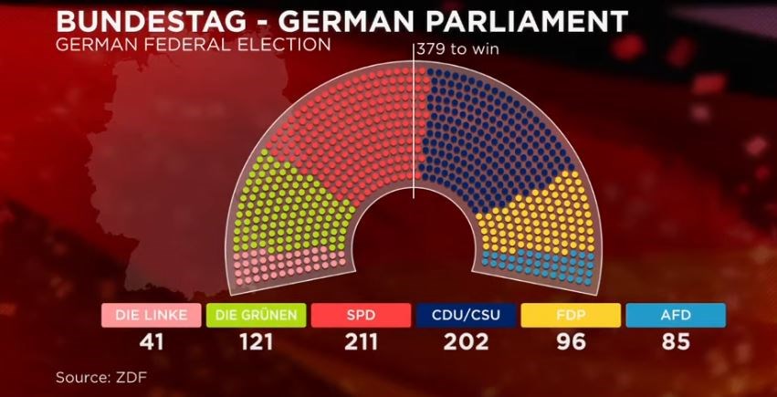 Απόλυτη ισοπαλία έδειξαν τα exit polls μετά το κλείσιμο της κάλπης στη Γερμανία, καθώς οι Σοσιαλδημοκράτες (SPD) και οι Χριστιανοδημοκράτες (CDU) έλαβαν το 25% των ψήφων. Οι Πράσινοι, οι οποίοι μέχρι τον Απρίλιο προηγούνταν στις δημοσκοπήσεις, έλαβαν  15%, ενώ το ποσοστό των Ελεύθερων Δημοκρατών φτάνει το 11%. Το αριστερό Die Linke κέρδιζε 5% των ψήφων, με το οποίο μπαίνει στη Βουλή, ενώ η ακροδεξιά Ενναλακτική για τη Γερμανία έχει ποσοστό 11%.