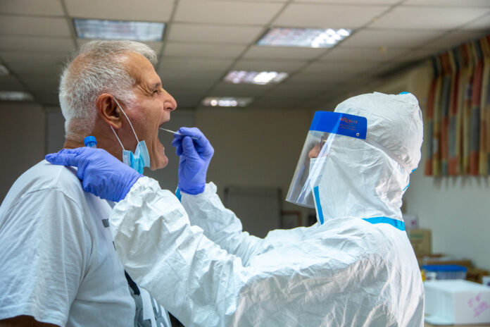 Health care workers take test samples of Israelis to check if they have been infected with the Coronavirus, at a Clalilt health center in Lod, on July 05, 2020. Photo by Yossi Aloni/FLASH90 *** Local Caption *** בדיקת קורונה קופח כללית לוד