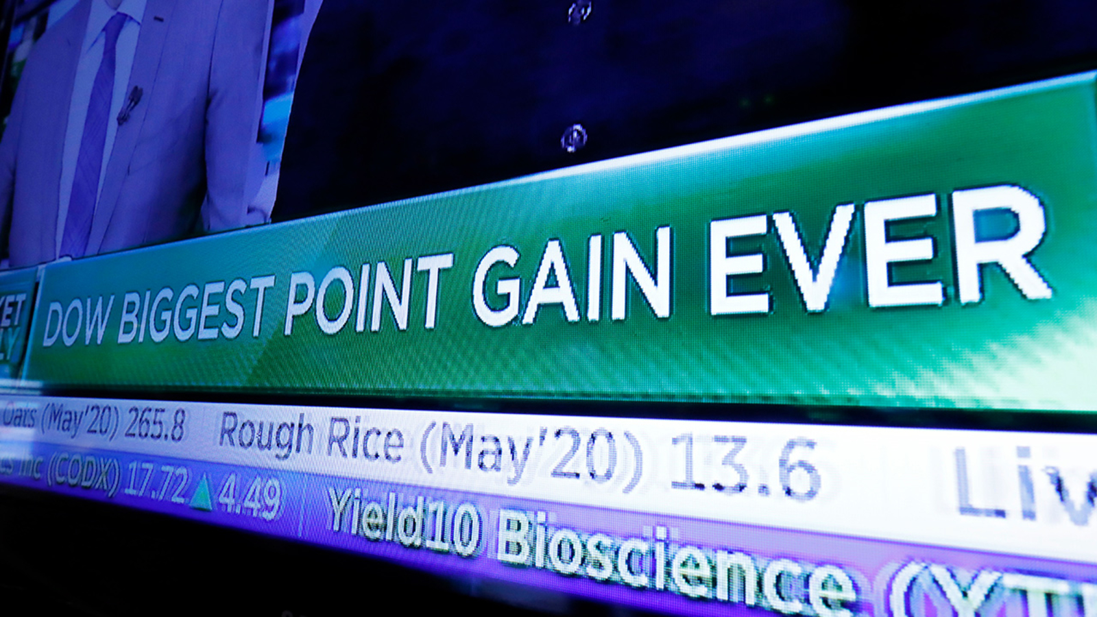 Αυτή ήταν η καλύτερη επίδοση του δείκτη σε μονάδες στην ιστορία του, ενώ σε ποσοστιαία βάση ο Dow με άλμα 5,1% σημείωσε τη μεγαλύτερη άνοδο από τον Μάρτιο του 2009. Ο βιομηχανικός δείκτης και ο ευρύτερος S&P 500 κατάφεραν ταυτόχρονα να τερματίσουν ένα αρνητικό σερί επτά διαδοχικών πτωτικών συνεδριάσεων.
